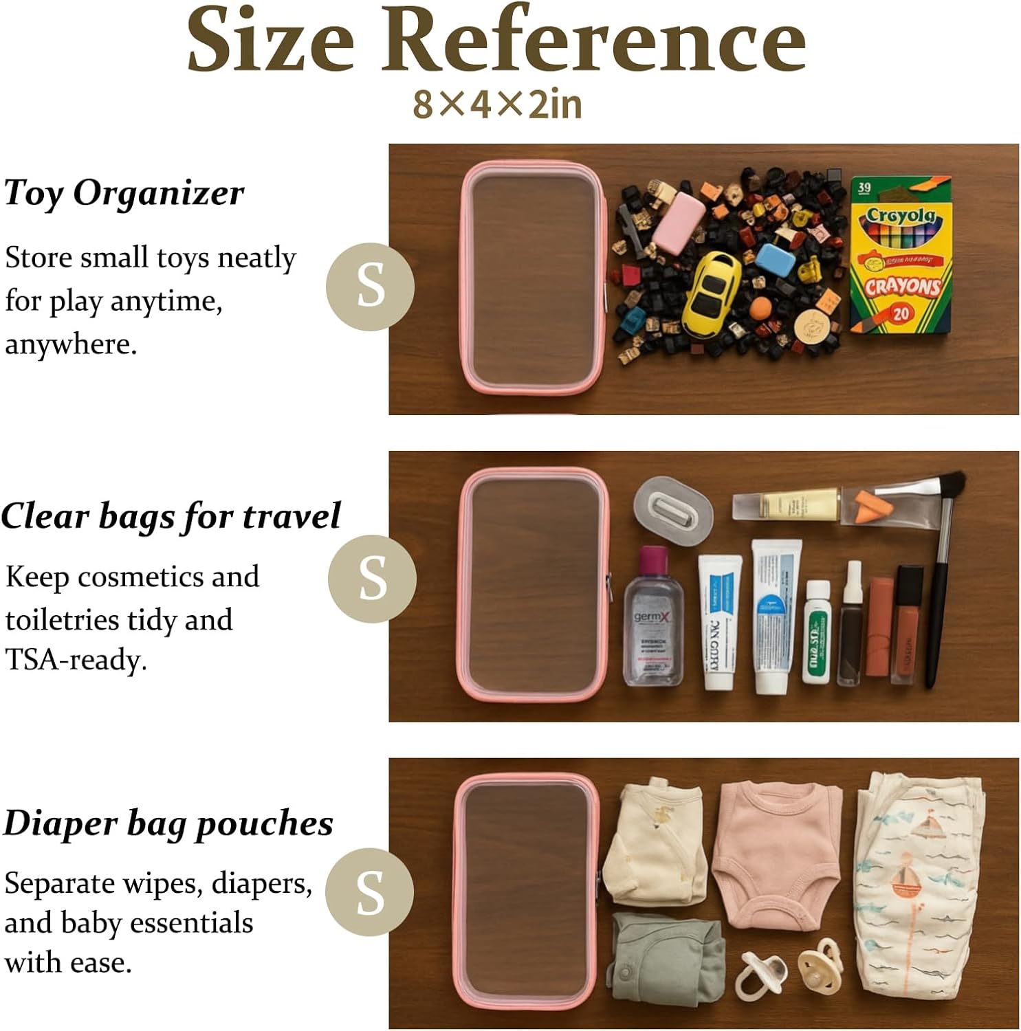 - Multi-Use Storage for Daily Essentials. Perfect as a bag organizer for makeup, toiletries, charging cables, pens, or travel-size items. Whether at home or packing a diaper bag, these clear zipper pouches help sort small items with ease.