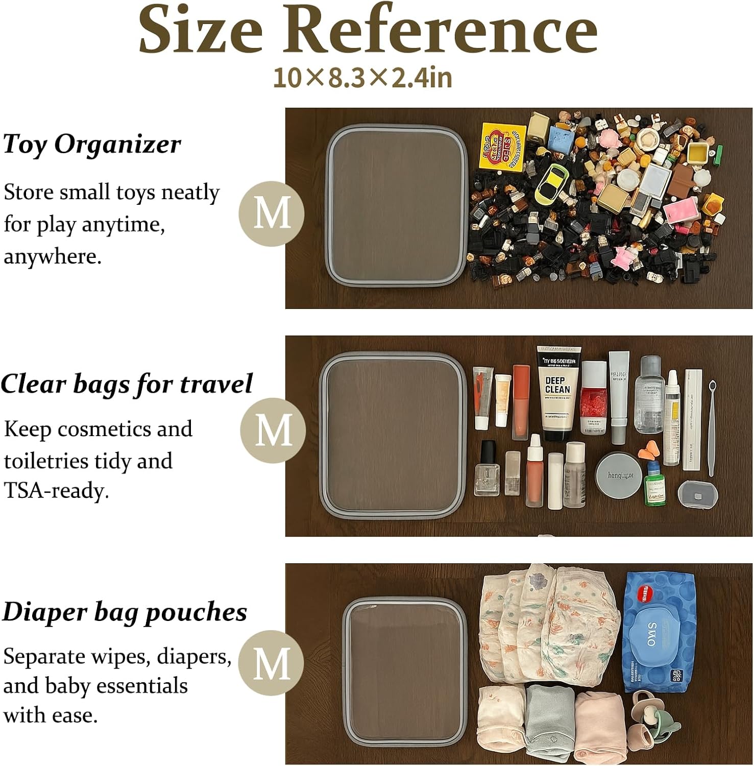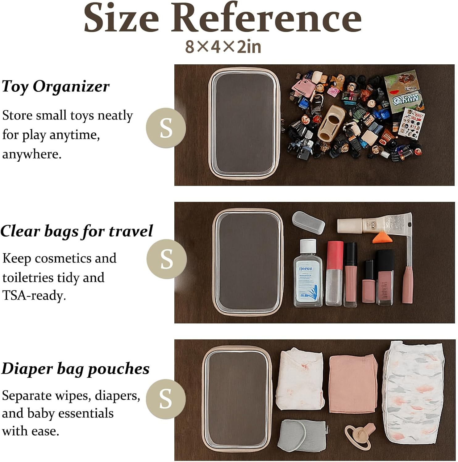 • Multi-Use Storage for Daily Essentials. Perfect as a bag organizer for makeup, toiletries, charging cables, pens, or travel-size items. Whether at home or packing a diaper bag, these clear zipper pouches help sort small items with ease.