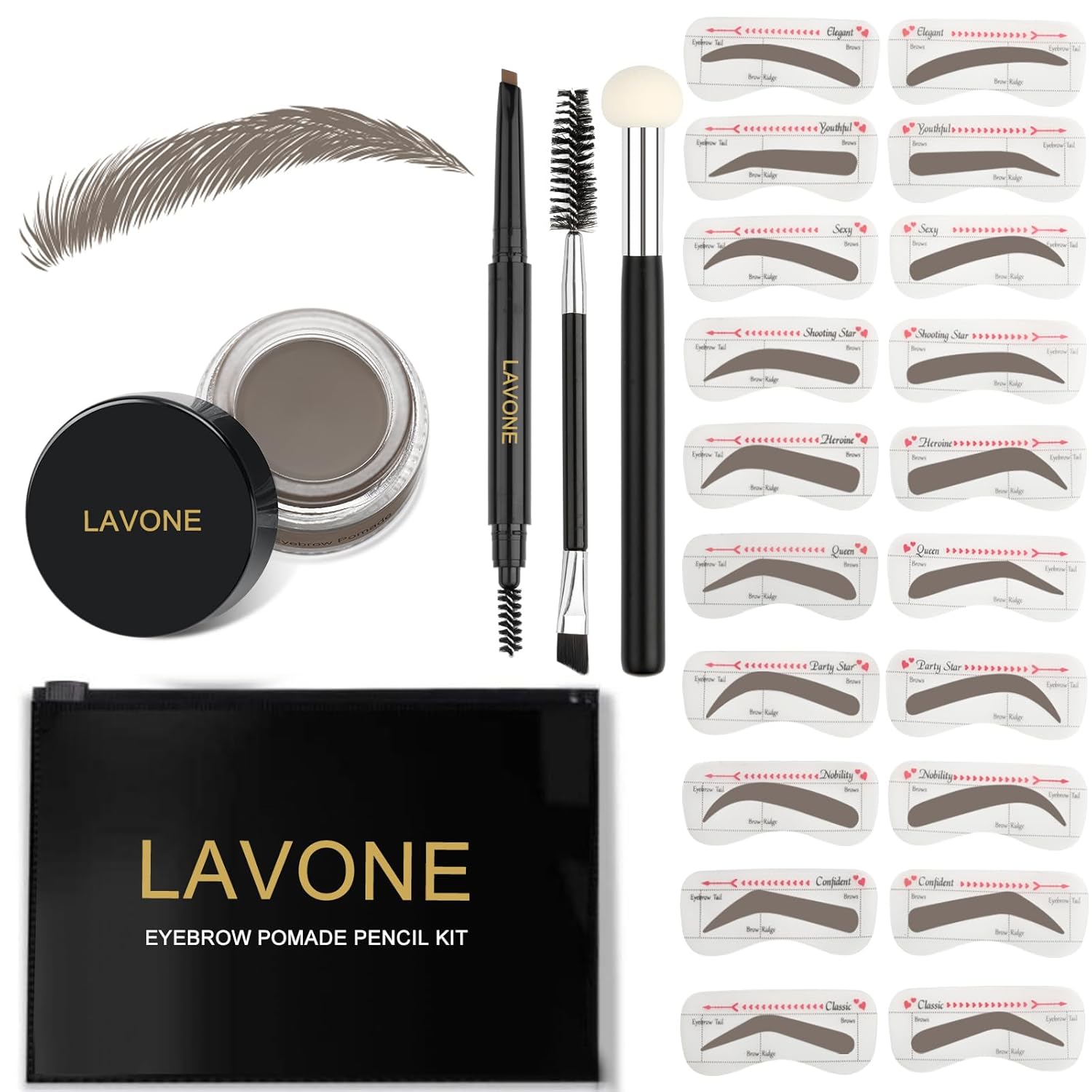 - [Whatโs in the eyebrow kit]: LAVONE makeup eyebrow kit includes brow pencil, eyebrow powder 20 eyebrow stencils (10 different shapes), a sponge applicator, a dual precision brush and a zipper pouch for on the go.