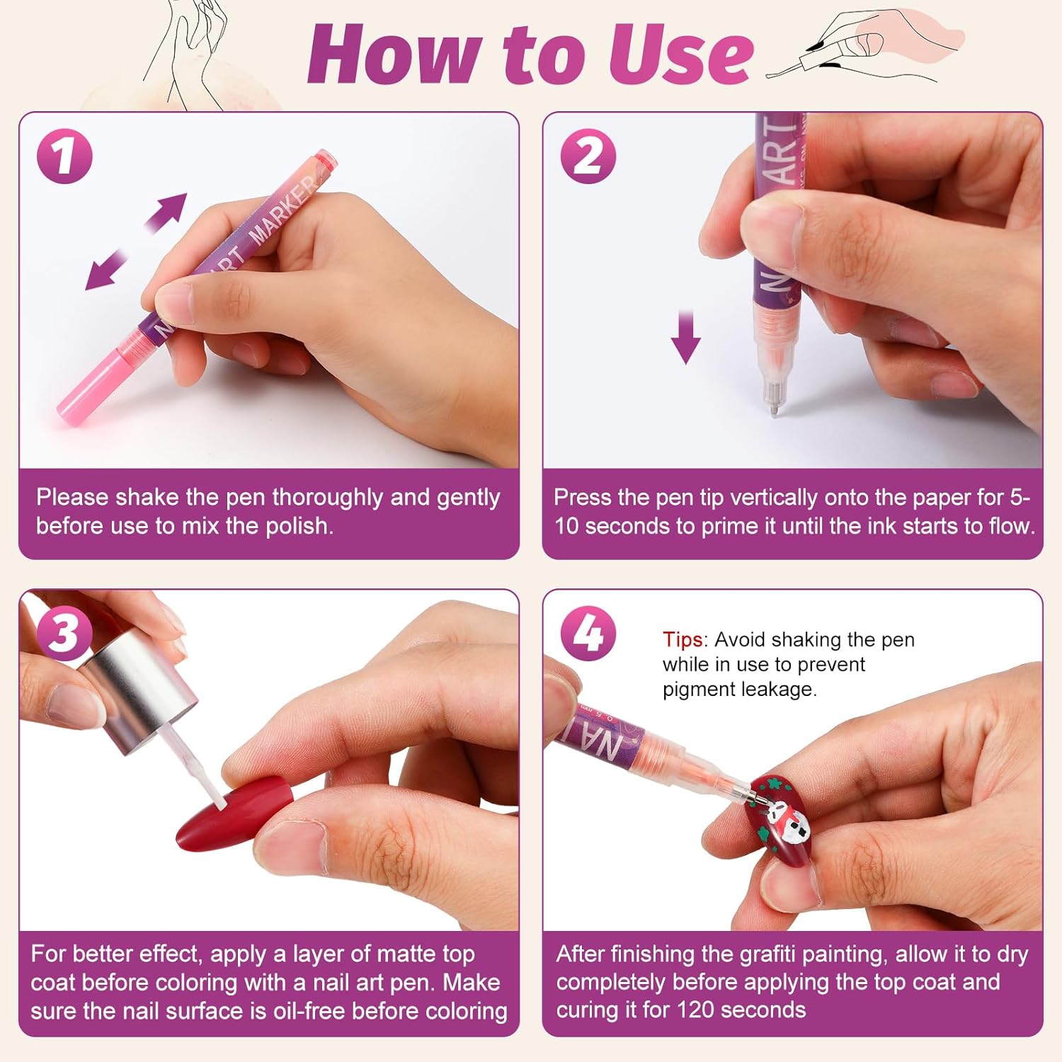 - EASY TO USE: No professional nail art skills are required; you can start creating right away. Simply shake the pen gently before use and press the tip vertically for 2-3 seconds. The smooth ink flow and easy control ensure you'll quickly achieve a satisfying manicure