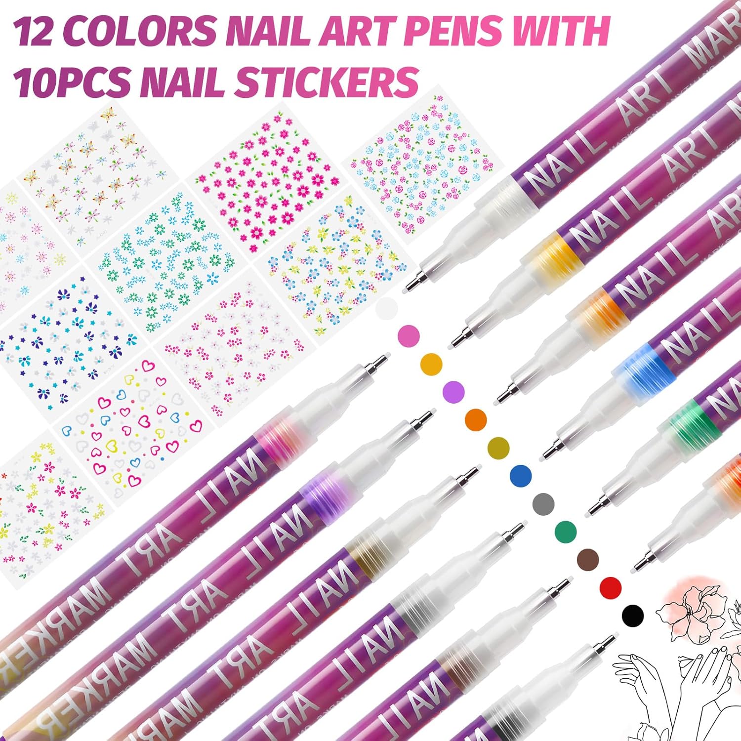 - PACKAGE INCLUDES:You will receive 12 nail polish markers in a variety of colors and 10 beautiful nail art stickers with a variety of designs. These stickers allow you to quickly decorate your nails without complicated painting, easily meeting the needs of various people