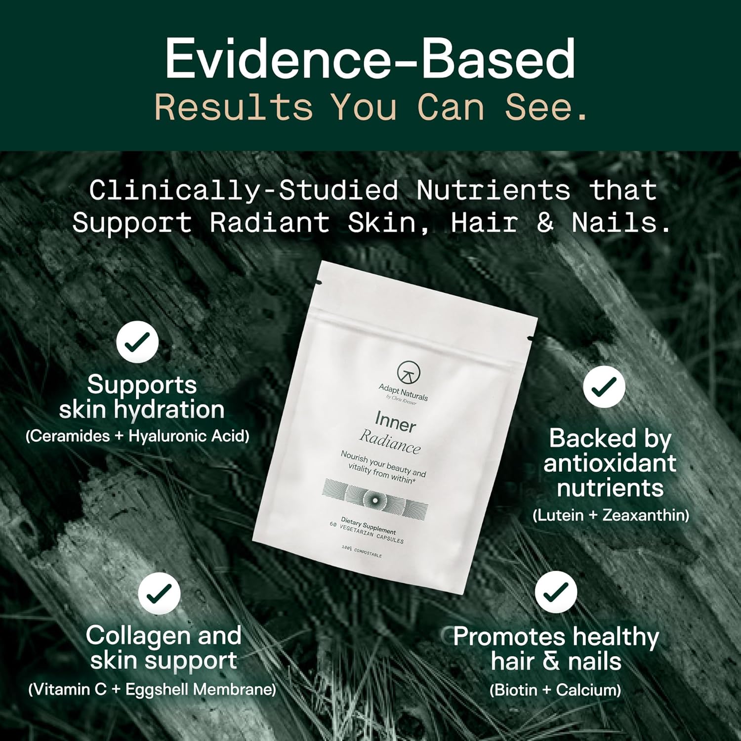 - EVIDENCE-BASED, QUALITY INGREDIENTS: Adapt Naturals Inner Radiance combines a synergistic blend of clinically studied nail hair skin vitamins and ingredients—including eggshell membrane collagen, hyaluronic acid, rice ceramides, lutein & zeaxanthin, biotin, and vitamin C—delivered at research-backed doses to nourish your beauty and vitality from within.