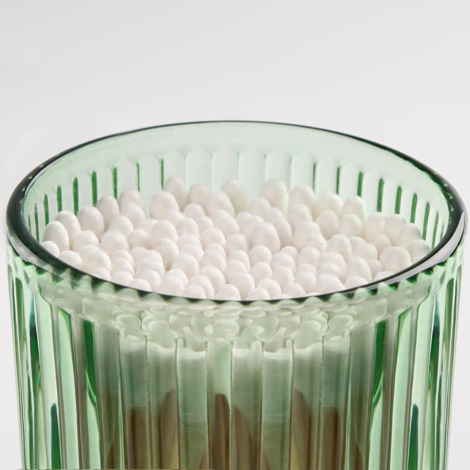 - Elegant Bathroom Organizer & Storage -Introducing our 9.8oz (3.9 x 3.5 inch) glass qtip holder with lid. Perfect for storing cotton swabs, cotton balls, cotton pads, bath salts, floss picks, hair tiesand more. This stylish and versatile bathroom accessory keeps your vanity, countertop, or dresserneat while adding a modern touch to your home dรฉcor. ldeal for bathroom, dorm, bedroomkitchen, or office organization. Available in multiple colors to match any style